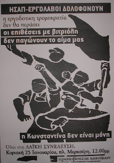 Λαϊκή συνέλευση, ύστερα από πρωτοβουλία κατοίκων των γειτονιών μας, θα πραγματοποιηθεί την Κυριακή 25 Ιανουαρίου 2009 (12.00) στην πλατεία Μερκούρη, στα Άνω Πετράλωνα. Κεντρικό ζήτημα της συνέλευσης είναι η υπόθεση της Κωνσταντίνας Κούνεβα και η παραπέρα συνέχιση της δράσης μας.
