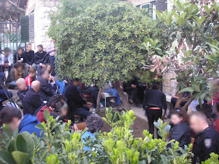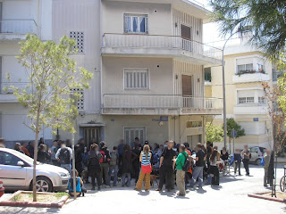 14.00: Νωρίς το μεσημέρι η κατάληψη δέχεται επίσκεψη από έναν υπεύθυνο του Ιπποκράτειου, μαζί με τον υπεύθυνο της ασφάλειας του νοσοκομείου. Ισχυρίζονται ότι είναι ιδιοκτησία τους ο χώρος*, ότι δεν έχει πάρει κανείς άδεια για την κατάληψη (!) και απειλούν ότι θα καλέσουν την αστυνομία, όπως και γίνεται. Μέσα σε λίγα λεπτά συγκεντρώνονται δεκάδες κάτοικοι στο χώρο, ενώ οι υπεύθυνοι του Ιπποκράτειου μαζί με το περιλοπικό που φθάνει στο σημείο αναχωρούν, προφανώς για το τοπικό αστυνομικό τμήμα.