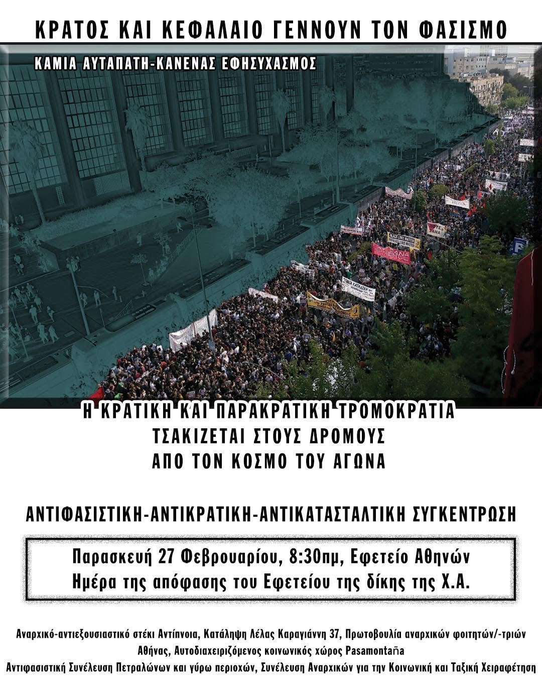 Στις 7 Οκτώβρη του ’20, ημέρα απόφασης της δίκης της Χ.Α σε πρώτο βαθμό, έξω από το Εφετείο Αθηνών πραγματοποιείται μία από τη μαζικότερες αντιφασιστικές κινητοποιήσεις των τελευταίων δεκαετιών στον ελλαδικό χώρο. Μέσα στους δεκάδες χιλιάδες συγκεντρωμένους ήταν και το πιο ριζοσπαστικό και μαχητικό κομμάτι των κινημάτων που για χρόνια έβαζε αναχώματα στην επέλαση των παρακρατικών ταγμάτων εφόδου. Η καταδίκη της Χ.Α. από τη θεσμική δικαιοσύνη, ήταν αποτέλεσμα της μεγάλης κοινωνικής πίεσης και στόχευε τόσο στην επανανομιμοποίηση του συστήματος όσο και στο ξέπλυμα του κράτους ως βασικό ενορχηστρωτή των παρακρατικών επιθέσεων. Η Χ.Α. καταδικάστηκε ως εγκληματική οργάνωση, με τα περισσότερα ηγετικά στελέχη να καταδικάζονται για διεύθυνση (με τον Μιχαλολιάκο να είναι πλέον εκτός φυλακής) και μόλις 11 μέλη των ταγμάτων εφόδου για ένταξη, με τα περισσότερα να είναι ήδη ελεύθερα εξαιτίας των χαμηλών ποινών. Στις 15 Ιουνίου του 2022 είχε ξεκινήσει το εφετείο της δίκης της Χ.Α και τώρα στις 27 Φεβρουαρίου αναμένεται η έκδοση της απόφασης. Οι υποθέσεις που συμπεριλήφθηκαν στη δικογραφία ήταν μόνο ένα μέρος από την επί 4 δεκαετίες δράση της Χ.Α, με εκατοντάδες δολοφονικές επιθέσεις σε αναρχικούς, αντιφασίστες, αριστερούς αγωνιστές και συνδικαλιστές, σε πρόσφυγες και μετανάστες, σε καταλήψεις και αυτοοργανωμένες δομές αγώνα. Χτυπώντας ακριβώς εκεί που της υποδείκνυαν κράτος και αφεντικά προωθώντας τα συμφέροντά τους και πάντοτε με τη συνδρομή και την ασυλία που της παρείχαν οι θεσμοί και η «αστική δικαιοσύνη», πάντοτε χέρι-χέρι με τις κρατικές συμμορίες, οι οποίες όποτε χρειαστεί επιχειρούν να πάρουν τη ρεβάνς για τις ήττες των φασιστών. Πιο πρόσφατο παράδειγμα αποτελεί σφοδρή επίθεση και οι 4 συλλήψεις που έγιναν στην αντιφασιστική διαδήλωση στη Θεσσαλονίκη, στις 31 Γενάρη, σε κάλεσμα ενάντια στους φασιστές του Ιερού Λόχου που επιχείρησαν να βγουν από τις τρύπες τους, με πρόσχημα την επέτειο των Ιμίων. Γιατί ο φασισμός βρίσκεται στον πυρήνα του κρατικού-καπιταλιστικού συστήματος που εδραιώνεται πάνω στην ιεραρχία και τις ανισότητες, πάνω στην εκμετάλλευση και καταπίεση του κοινωνικού σώματος, πάνω στην βία εις βάρος του «εσωτερικού εχθρού» και των πιο ευάλωτων. Από τους πολέμους, τις στρατιωτικές επεμβάσεις, τα στρατόπεδα συγκέντρωσης, τους αμέτρητους δολοφονημένους στα χερσαία και υδάτινα σύνορα μέχρι τους βασανισμούς και τις δολοφονίες μέσα στα αστυνομικά τμήματα και στα μπλόκα και τους εκατοντάδες νεκρούς στα κάτεργα της μισθωτής
