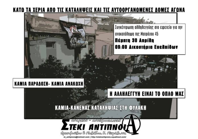 Συγκέντρωση αλληλεγγύης στο εφετείο για την ανακατάληψη της Ματρόζου 45